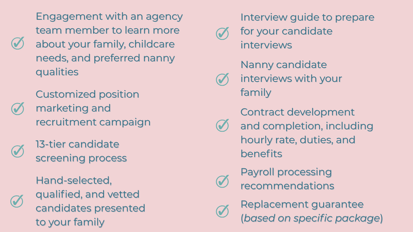 Once you accept our proposal, sign the Family Services Agreement, and pay the initial Search Fee, we create a personalized job description and begin recruiting/screening applicants.